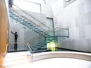An engineering marvel of standing tension, this all-glass staircase is completely unsupported; cantilevered with unique fabricatation, including extensive CNC edgework and 4-ply SentryGlas structural laminate.